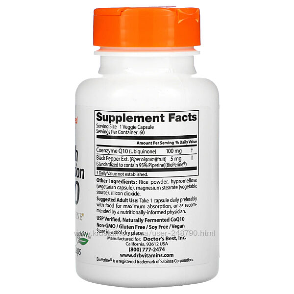 Добавка «Коэнзим Q10 с высокой степенью всасывания» от Doctor´s Best содержит чистый коэнзим Q10 (убихинон) и BioPerine® (экстракт черного перца).
