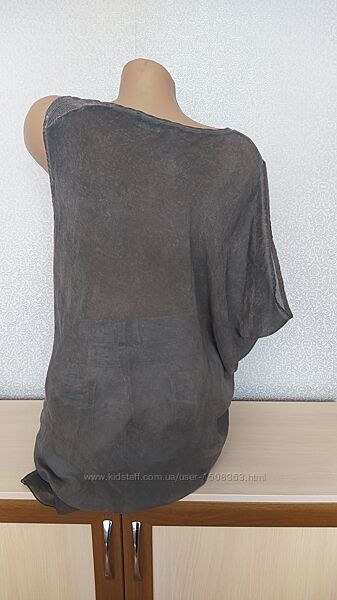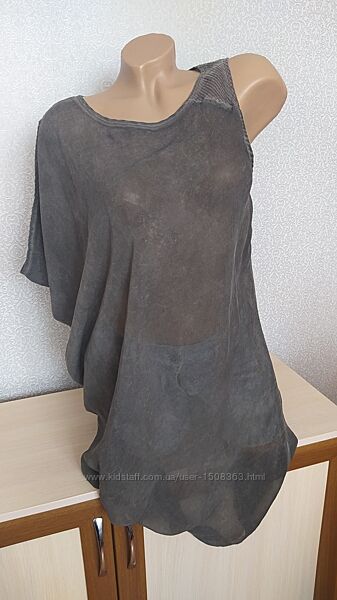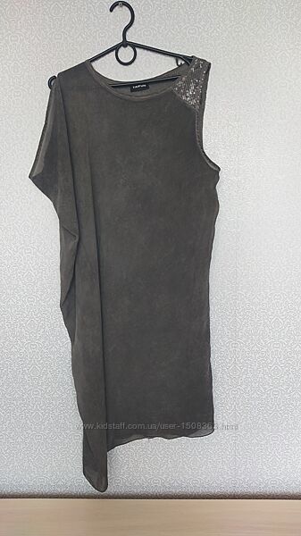 Шикарное ассиметричное легкое платье. Скроено таким образом, что с одной стороны образуется ненавязчивая драпировка. Одно плечо украшено паетками. Длина по середине спинки 94. Пог измерить не удается. Поб 57. Платье должно быть свободным. На размер 38, 40 подходит. Размер и состав не указан. Ткань очень нежная, варенка. Предположительно - шелк с вискозой.