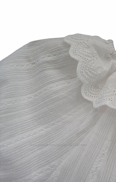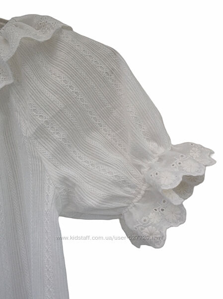 Нежная женская блузка прямого кроя сшита из тонкой хлопковой ткани.Верх и низ рукавов декорированы кружевным полотном из прошвы.