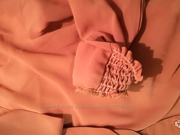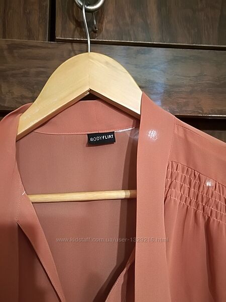 Блуза кирпичного цвета, на рукавах мягкая резинка, бант можно завязать как на уровне декольте, так и под горлом. Приятная к телу, просвечивает (но не критично, в офис носила на беж.белье) Состояние отличное, покупала в Бонприкс.