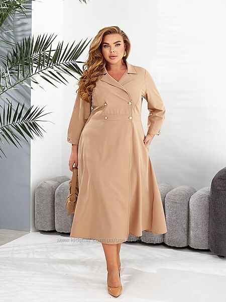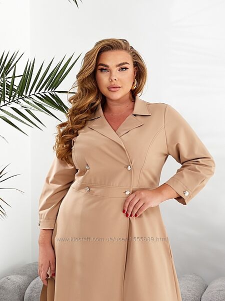 Дана модель виконана із класичної тканини у бежевому кольорі та кольорі морської хвилі.Сукня іде на запах. Має дві скісні кишені.