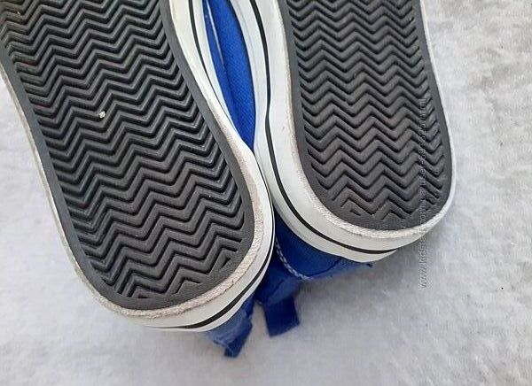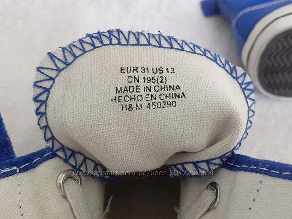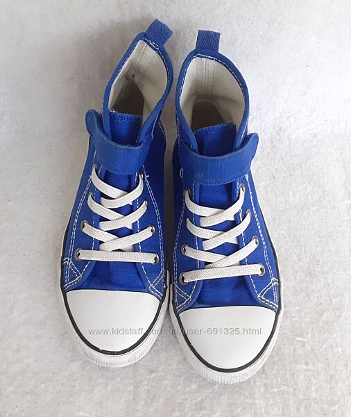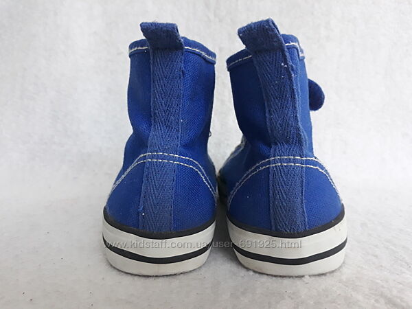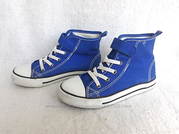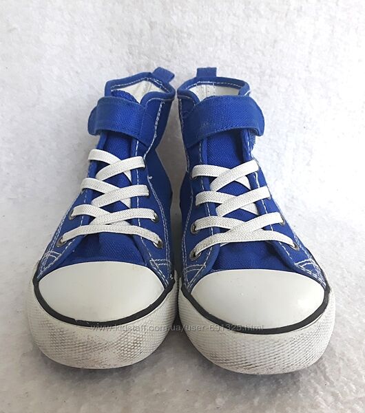 Пропоную високі сині кеди від H&M. Зашнуровані на гумку, зверху липучка. Уживані пару разів, акуратно, стан відмінний, дефектів немає, дивіться фото.Розмір вказаний 13 (31) маломіряють. Довжина устілки усередині 19 см.