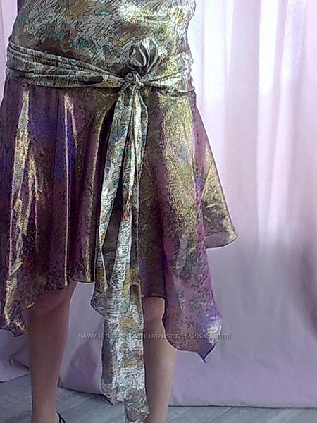 Очень красивая вещь!Девушка в нем выглядит как принцесса. Приятная на ощупь тоненькая ткань вся пронизана золотистой нитью. Сочетание фиолетового, светло-серого и золота просто изумительно! До бедер ровное, затем отрезная заниженная юбка, подчеркивается -драпируется поясом. Подол неровный, летящий Длина по спинке 100 см, между подмышками 43 см, ПО бедер 47 см Новое, без магазинной этикетки