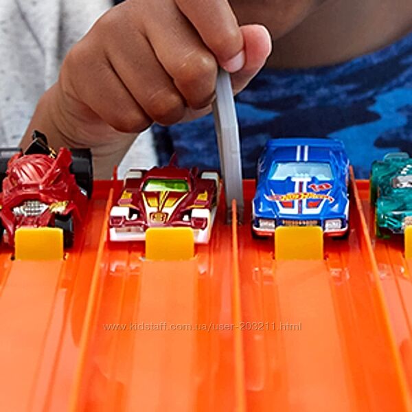 В набор входит: пусковая установка, флаг, чтобы определить истинного победителя, и 1 автомобиль Hot Wheels.
