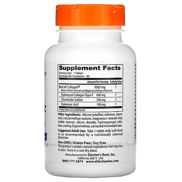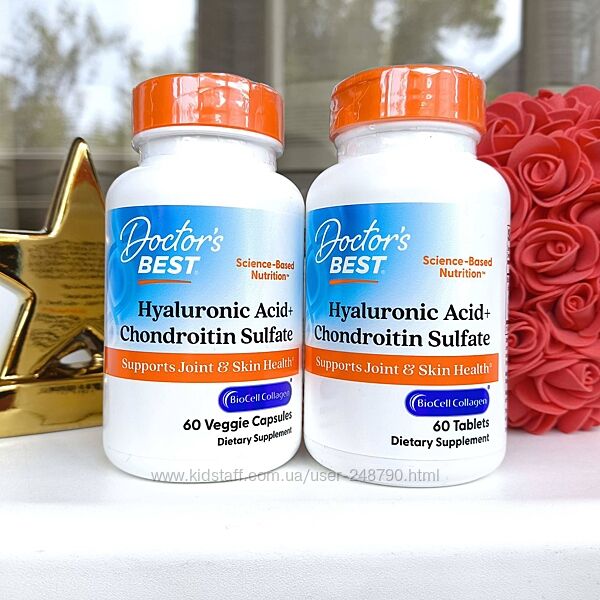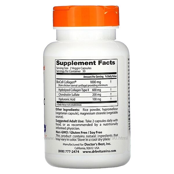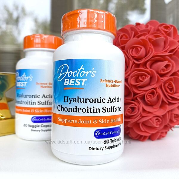 Гіалуронова кислота та хондроїтину сульфат від Doctor ́s Best містить патентований колаген BioCell — дієтичний інгредієнт, у якому міститься патентована суміш гідролізованого колагену типу 2 природного походження, хондроїтину сульфату та гіалуронової кислоти в добре засвоюваній формі.