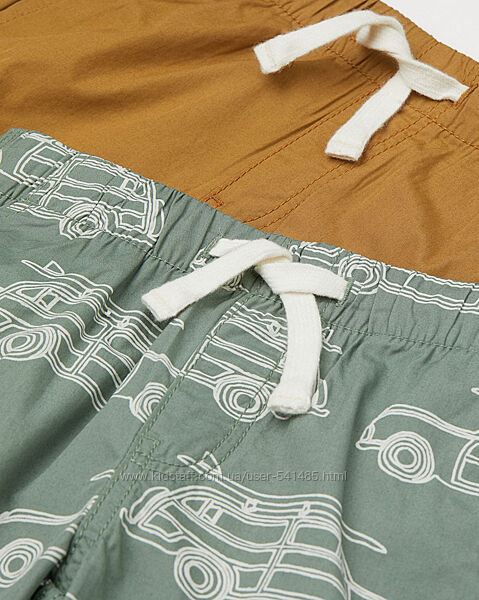 Шорты из комплекта 2 шт. из хлопковой ткани с боковыми карманами, внутри пояса широкая резинка и действующий шнурок. Продаются поштучно, бирка на одних. Из новой коллекций детской одежды ведущего европейского бренда H&M.Размер в наличии: 6-7 лет, рост 122 см, цвета в наличии: светлый хаки с машинками