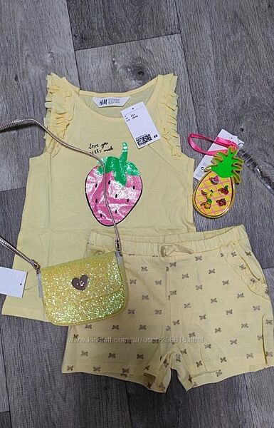 В наличии суперские комплекты Н&М для девочек 💛 выполнены из хлопка , маечка и шортики украшены красивыми блестящими принтами 🍓🦋шортики с карманами, в поясе мягкая эластичная резиночка 💛размер 110-116 см и 134-140 смцена комплекта 330 грн 💛