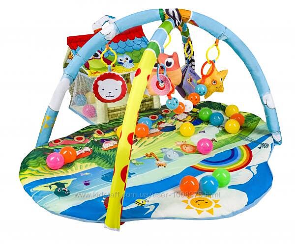 для игрушек предусмотрено дополнительное отделение в форме домикаформы и цвета стимулируют чувства ребенкаковрик выполнен из качественных материаловподвесные игрушки и шарики входят в комплектХарактеристики