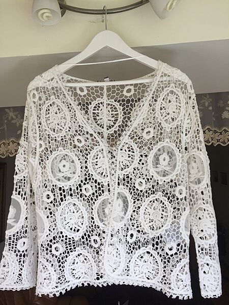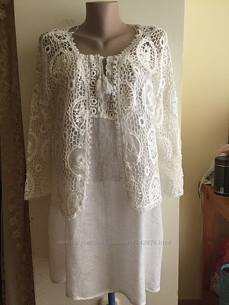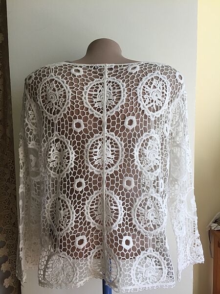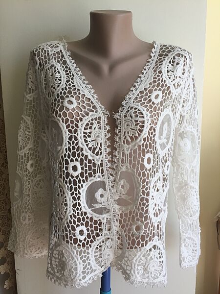 Ажурный (как плетенное натуральное кружево) нарядный легкий мягкий удобный пиджачок украсит любое платье , блузку и футболку! Состав:80% cotton. 20% polyester, Без бумажной бирки,Не носился! Состояние новой вещи!Доставка:Доставка за ваш счет,предоплата, возвратов нет