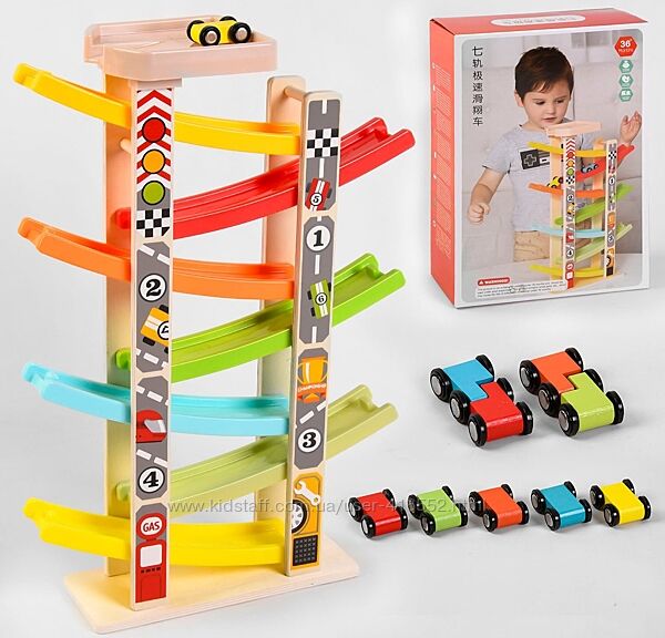 Игровой набор для мальчика парковка-гараж на шесть этажей, 4 машинки в комплекте Парковка Fun Racing Track изготовлена специально для малышей, которые любят головокружительные заезды в которых каждый новый спуск - физическое явление! Многоуровневая проковка насчитывает 6 ярусов, где каждая дорожка окрашена в абсолютно новый цвет. Основание изготовлено из дерева, а горки - пластмассовые. Парковка выполнена без острых углов и окрашена в светлые, пастельные цвета. В набор входит 4 разноцветных машинок перевертышей.Каждая машинка имеет 4 пластиковых колеса с металлическим защитным болтом и деревянное, фигурное основание. К спуску или на вершину крепится пластмассовая платформа, которая выступает прямым продолжением трассы.