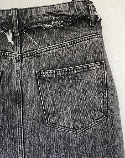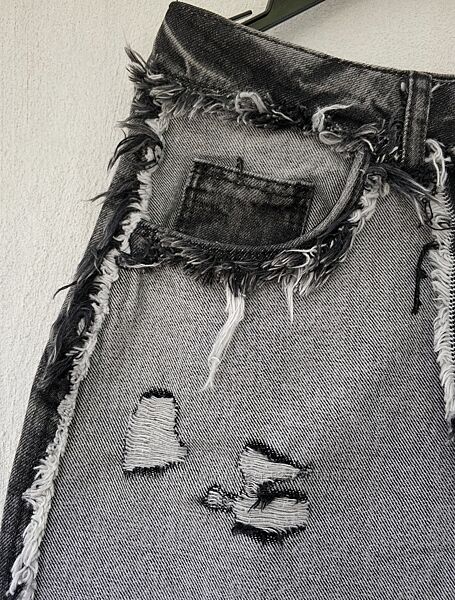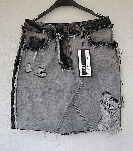 Юбка джинсовая двухцветная с "изнаночными швами ", элементами порванностей и потертостейИзделия закрывается спереди на молнию и пуговицу