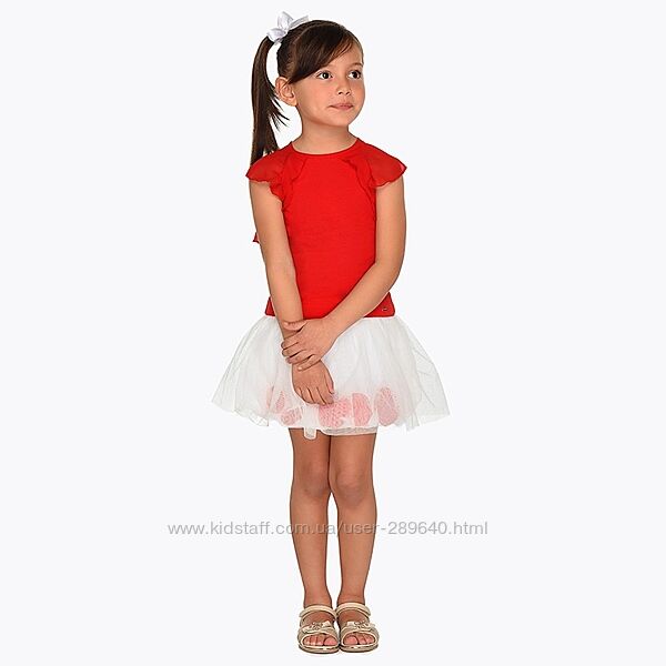 Костюм комплект от испанского бренда Mayoral пышная юбочка + блуза футболка:-- красный: 104 см на 4 года; 110 см на 5 лет; 116 см на 6 лет; 122 см на 7 лет; 128 см на 8 лет; 134 см на 9 лет;-- розовый: 104 см на 4 года; 110 см на 5 лет; 116 см на 6 лет; 122 см на 7 лет; 128 см на 8 лет; 134 см на 9 лет.