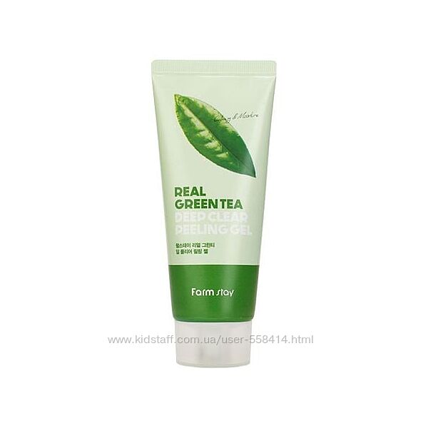 - Пилинг-гель с зеленым чаем Farmstay Real Green tea Deep Clear Peeling Gel с зеленым чаем мягко очищает кожу, ускоряет отшелушивание омертвевших клеток, препятствует появлению закупоренных пор, устраняет тусклый оттенок лица и делает кожу свежей и сияющей.