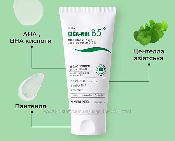 ЕХР 24.04.2026Пілінг-скатка з кислотами Medi-Peel Phyto Cica-Nol B5 AHA BHA Vitamin Calming Peeling Gel ефективно усуває ороговілий шар епідермісу, позбавляючи надлишку себума і різних забруднень. Вона ретельно полірує шкіру, надаючи їй мякості, стимулює процеси регенерації та оптимізує проникнення активних інгредієнтів доглядових продуктів.