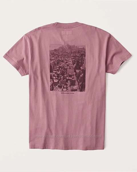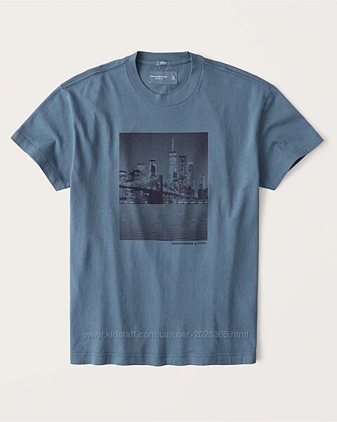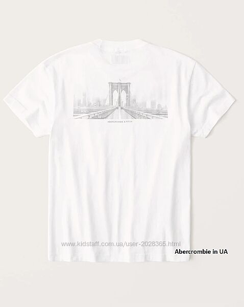 Фото 8: Классическая футболка Abercrombie & Fitch с короткими рукавами и круглым вырезом из мягкой ткани плотностью 180г с изображением города в тон и графического логотипа