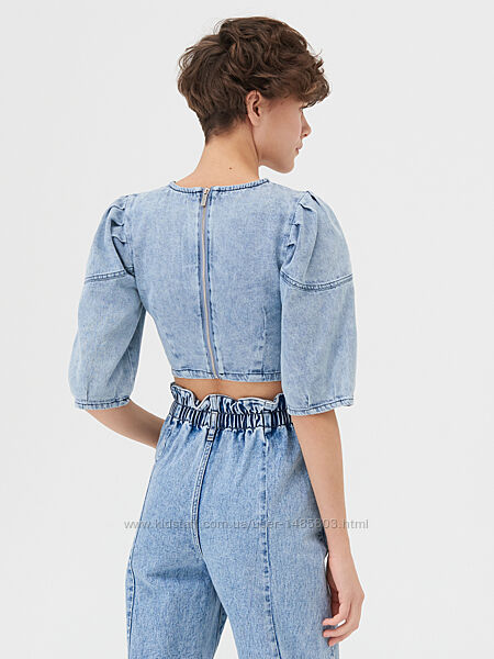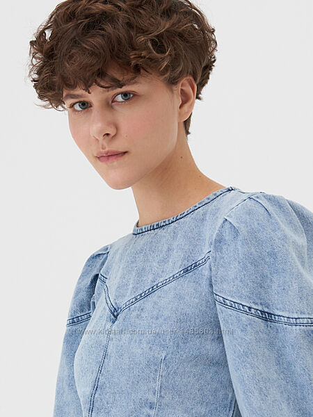 Стильная джинсовая блуза длиной по талию с объёмнымирукавами буф. Сзади застёжка на метал. разъёмной молнии.