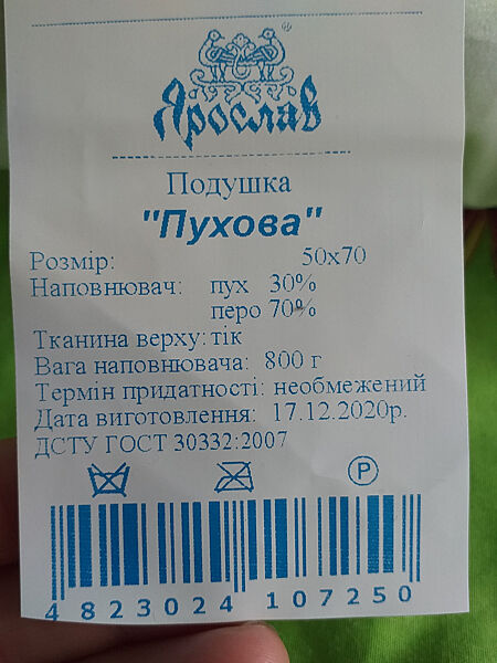 ЦІНА ВКАЗАНА ЗА РОЗМІР 70Х50Подушка пухова 30% пуху/70% пір´я ТМ Ярослав