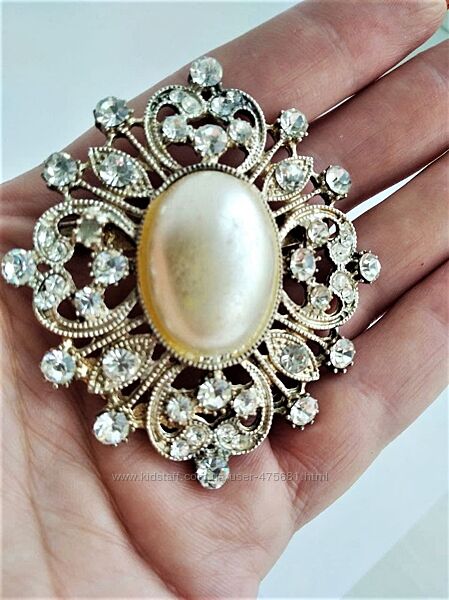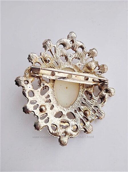 Винтажная брошь с центральным кабошоном из перламутра украшена кристаллами.В хорошем состоянии, незначительные потёртости перламутра, замочек рабочий.