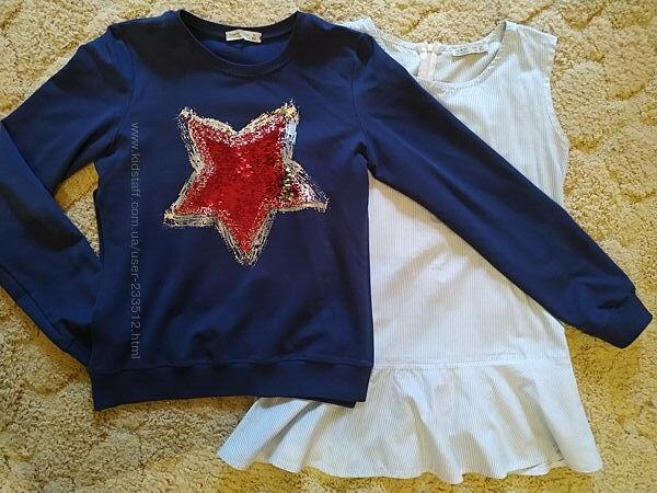 1. ПРОДАНО Синяя двойка со звездой из паеток. Рост написан 164, но идет на 150-155см. Длина хлопоквой майки 65, ширина 43, сзади на молнии, белая в бледно голубую полоску. Длина трикотажной кофты 54, ширина под рукавами 43, плечи 34, рукав 57. По бокам глубокие разресы через которые проглядывается майка. 72% хлопок, 22% полиэстер, 6% эластан. Состояние отличное. цена 130грн.