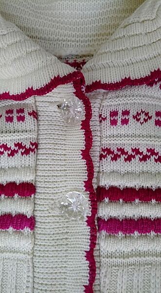 Вязанная кофта р.34 для девочки на возраст 6-7 лет, рост 122-128 см.Белая с красным узором, застегивается на пять пуговиц, широкий воротник, два кармана.