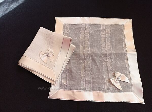 Очень красивые салфетки , по краю пошит атлас молочного цвета, край с отделкой люрексовой нитью серебристого цвета. Средина полупрозрачная сжатка с отделкой люрекс. В уголке пришит милый бантик .