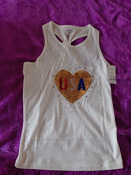 Летняя майка фирмы Carters с пайетками- перевертышами на 2 цвета, состав 100% хлопок. Произведено во Вьетнаме.На бирке: рост 150-156, вес 44-50 кг .