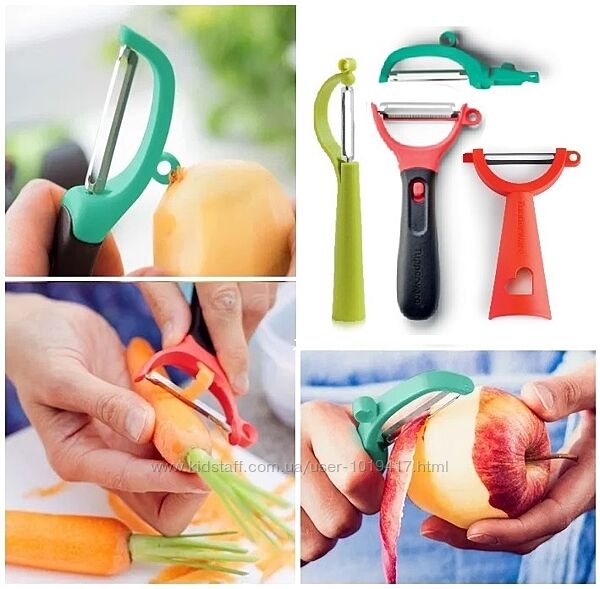 Лопатка - Отверстие посередине функционально и необходимо: оно позволит маслу спокойно стечь обратно в сковородку. - Специально рассчитанный угол в 140° между основанием и ручкой обеспечит удобный и быстрый захват- легко перевернуть или перенести на красивое блюдо. - Длина 33см, ширина 8,5см. Лопатка Широкая - Широкая часть лопатки имеет отверстия и скошенный край, обладает достаточной шириной, чтобы было удобно работать с большими кусками мяса и рыбы, благодаря чему удобно перевернуть, подцепить и переложить. - Продольные отверстия в широкой части лопатки предназначены для стекания жира. - Длина 32см, ширина 13см. Мастер-щипцы - Ложки щипцов имеют закругленные края. Благодаря матовой поверхности и эргономичной ручке щипцы удобно удерживать даже влажными руками. - Щипцы разделяются для различного применения и компактного хранения. - Длина 26см, ширина 5,5см. Силиконовый Скребок - Гибким и эластичным наконечником изделия легко удалить остатки горячей пищи, можно перемешивать и переворачивать продукты даже во время жарки на сковороде. Удобный для равномерного распределения начинки или крема. - Благодаря необыкновенной стабильности лопаточки, вы сможете даже делить тесто на порционные куски. Вертикальная Овощечистка (Зеленая) ХИТ продаж!!! Овощечистка Универсальная (Красная) - Очистка овощей и фруктов будет занимать минимум времени и приносить максимум удовольствия! - Имеет очень острое лезвие, позволяющее снимать кожицу настолько тонко, что сокращает потерю витаминов. - Эргономичная ручка овощечистки удобно ложится в ладонь. Не выскальзывает и не натирает руку. - Безопасная. - С одной стороны от лезвия расположена петелька для удаления глазков из клубней картофеля или моркови. - Можно также нашинковать овощи для салата. Получаются полупрозрачные лепестки, длину которых можно регулировать. - Лезвие закреплено на ручке таким образом, что им удобно очищать овощи любой формы. - Лезвие остается острым в течение долгого времени. Подставка для Кухонных Приборов - Подставка имеет компактные размеры и занимает минимальную площадь на поверхности. - Подставка разделена на четыре секции. Такая конструкция обеспечивает устойчивость, так как приборы не скучиваются в одном месте и не опрокидывают изделие. - В подставке разместятся все необходимые кухонные приборы. - Подставка под столовые приборы выполнена в черном цвете с бирюзовой вставкой. Она гармонично дополняет серию кухонных приборов «Диско». - Изделие разбирается для удобства мытья. Вынув бирюзовую вставку, Вы сможете тщательно промыть подставку вручную или в посудомоечной машине. - Размеры 12 х 12 х 16см