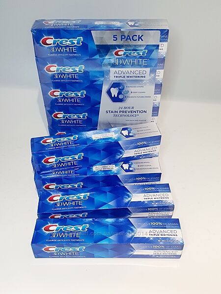 Crest 3D White Advanced Triple WhiteningПомогает удалить пятна с поверхности эмали. 24-часовая разработка предотвращения пятен. Защищает от кариеса и зубного камня. Сохраняет зубы чистыми и здоровыми. Вес 158 г