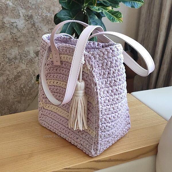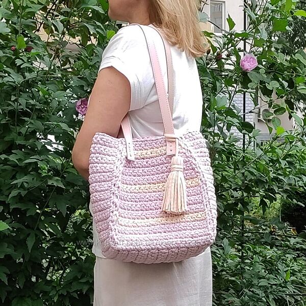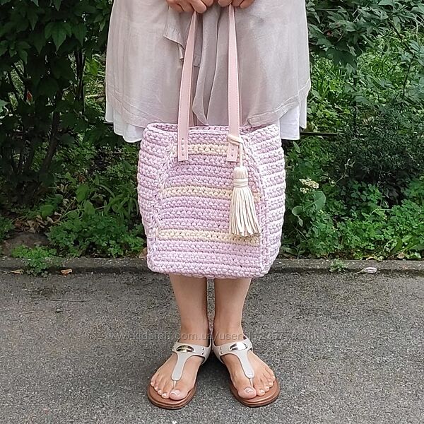 Сумка-шоппер в цвете розовая пудра с кожаными ручками и кисточкой.