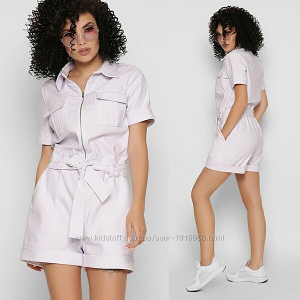 Джинсовый комбинезон в стиле Сафари. Модель выполнена в бежевом цвете. Имеет короткий рукав и шорты с фиксированным отворотом. 4 кармана: два накладных с клапаном на груди, два прорезных по бокам. На талии широкая эластичная резинка и съемный пояс в петлях. Спереди застежка-молния.Длина: 83 смРост модели: 168 смМатериал: ДжинсСезон: ЛетоСостав: 100%CottonТип застежки: МолнияРукав: 21 см
