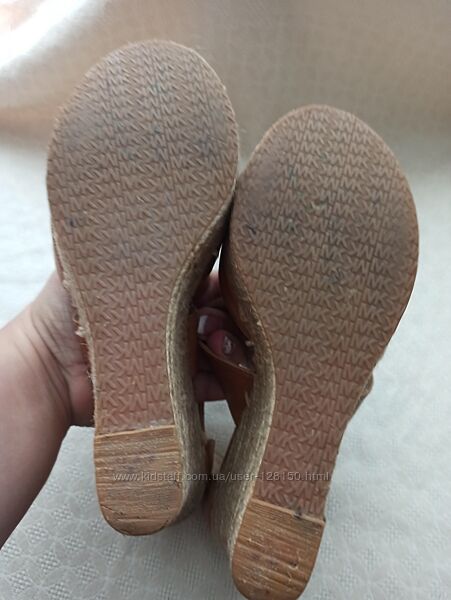 Очень красивые босоножки известного бренда в очень хорошем состоянии. Изготовлены из натуральной кожи. Внутренняя часть очень мягенькая кожа. Босоножки просто шикарные на ножке. Состояние передала на фото. Ношены интенсивно, но на состоянии не особо отразилось. Немного появились потертости на пяточке и пару пятен сбоку(на фото показала). Тереть и удалять ничего не пробовала так как боялась оставить пятна ещё больше. В реале, это в глаза не бросается. Местами нужно приклеить внутреннюю стельку. В цене это учла. Стоили больше 100 дол.Вся длина стельки 25,5(от самого края). На ножку 24,5-25 средней полноты. Высота под пяткой 10,5 а под пальцами 2,5