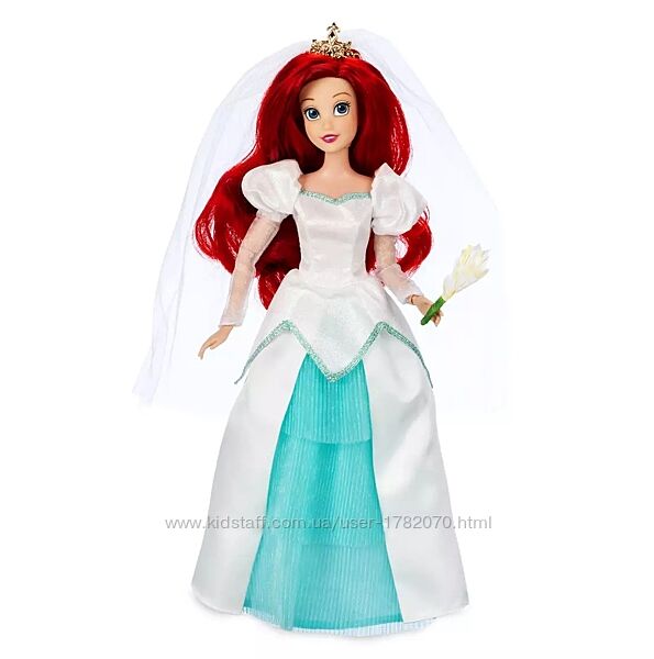 Набор из двух классических кукол Disney Русалочка Ариэль и Эрик в роскошных свадебных костюмах.На Ариэль блестящее переливающееся атласное свадебное платье с баской, рукавами-фонариками и прозрачной сеткой, прозрачная многослойная рифленая нижняя юбка и необычная отделка. Букет цветов и формованная обувь. Аккуратно уложенные, укорененные волосы. Сетчатая вуаль с золотой короной.