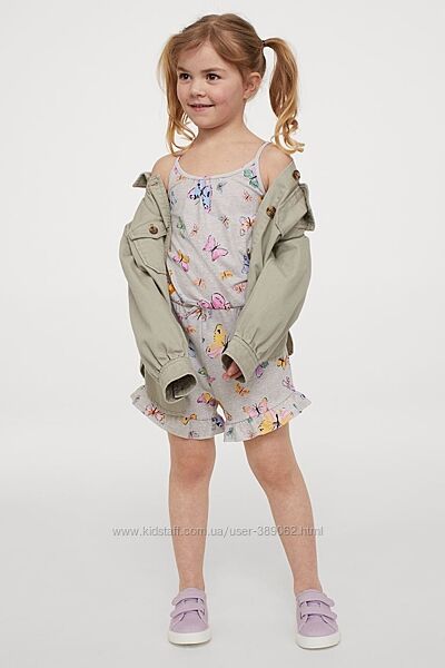 Літній комбінезон із бавовняного трикотажу з вузькими бретелями та декоративним складанням зверху. Модель відрізна з гумкою та декоративним бантиком на талії. Розмір 4-6, 6-8, 8-10 років