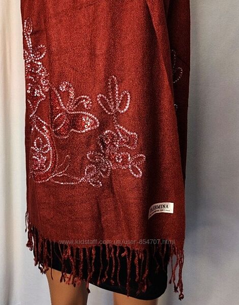 Шарф шаль палантин бордовый PashminaТеплый, лёгкий, мягкий приятный на ощупь изготовлен из качественной натуральной шерсти: 70% кашемир, 30% лана. С двух сторон вышит лентой, по краям кисти. Можно использовать как широкий шарф, шаль или палантин. Размер 190х70 см.