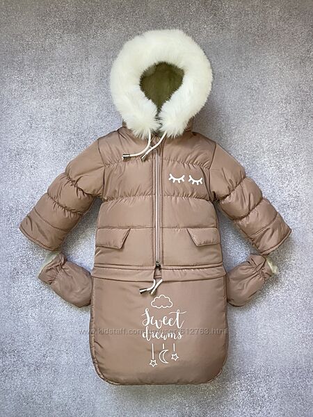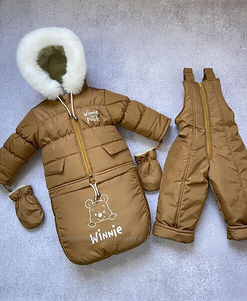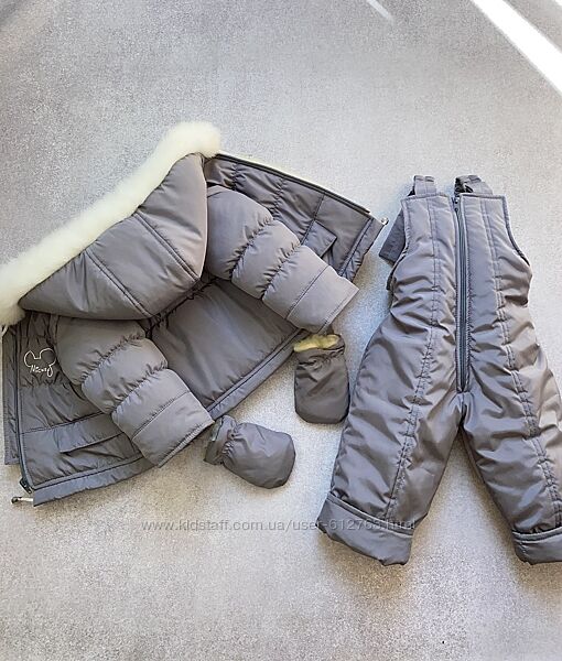 Теплий комплект зимовий Трійка 3 в 1 ( куртка з рукавичками та відстебним конвертиком, і штанці-полукомбінезон).