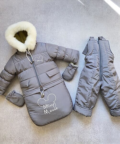 Складається з: куртки з відстібним конвертом, штанців і рукавичок. Розмір універсальний (62-80 ріст). З пристебнутим конвертом використовують від 0 до 6 місяців, а куртку зі штанцями від 6 місяців до 1,5-2 роки.