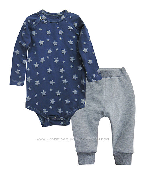 Комплект для малюків. Складається з боді, повністю запринтованого в срібні зірочки, і штанів на манжетах, широка резинка на поясі. Штани - трьохнитка без начісу (петлі).Склад: 100% бавовна.