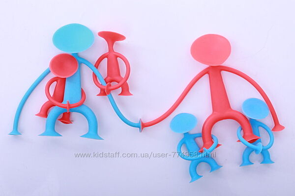 Семья Slbelly – забавные игрушки акробаты, не большого размера, потому ребёнок может брать их с собой куда угодно. На руках, ногах и голове каждого человечка есть присоски, что позволяет им легко крепиться к любой гладкой поверхности и друг к другу. Человечки изготовлены из силиконового геля, что позволяет им принимать любые положения и даже растягивать их. Набор Семья Slbelly состоит из двух родителей (размер 12х12 см, красного и голубого цвета) и двух малышей (размер 7×7 , красного и голубого цвета). Человечки Slbelly очень легки в уходе – в случае загрязнения нужно просто помыть в мыльной теплой водой.Отличный компаньон для ребенка : может использоваться как отдельная игрушка или как дополнение к другим игрушкам с гладкой поверхностью.