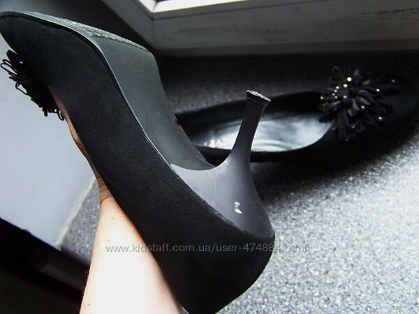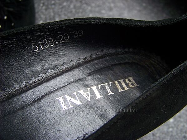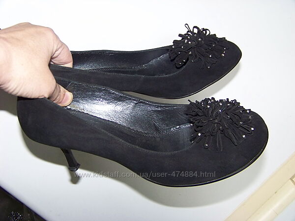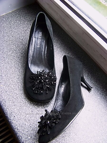 Натуральные замшевые черные туфли на удобной средней шпильке длиной 7 см. Внутри также кожаные натуральные. ТМ Billiani, размер указан 39, стелька 25.3 см. Полнота средняя, ширина подошвы в самом широком месте 8.5-8.7 см. Носочек круглый, очень аккуратно выглядят. Украшены брошкой из лапши замшевой и страз.Покупались по акции: спереди на одной туфле чуть выступил клей, на каблуке есть мелкая непрокраска. Видно на фото. Туфли новые, были обуты один раз и то в квартире.
