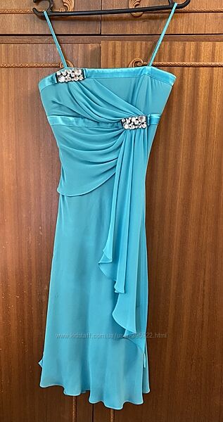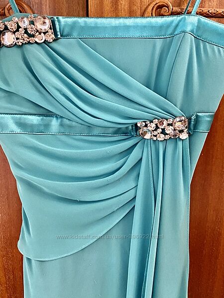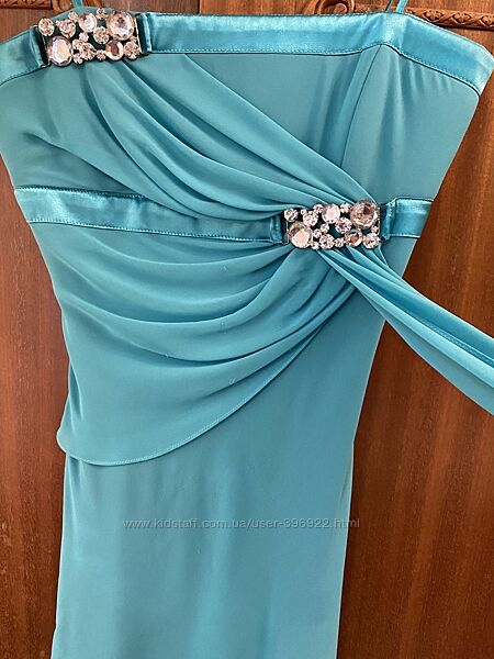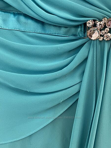 Гарна святкова сукня з шифону. Зсередини бавовняний підклад, сукня прикрашена стразами та атласною стрічкою.Ніжний струмневий силует, дуже красивий бірюзовий колір.