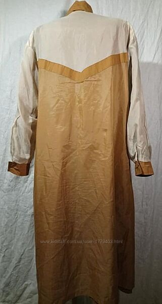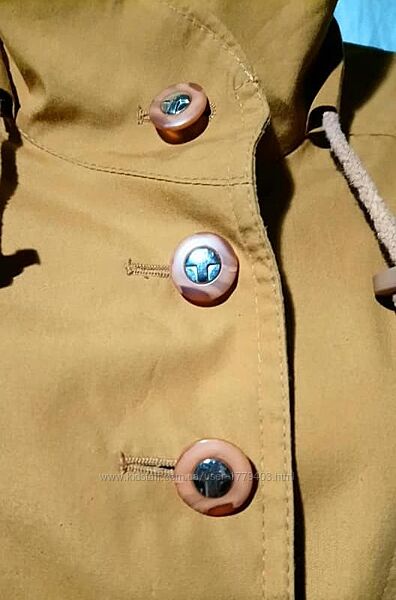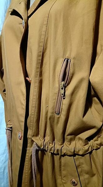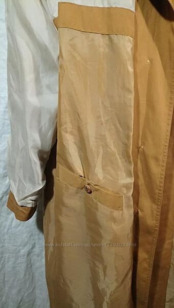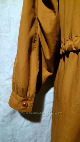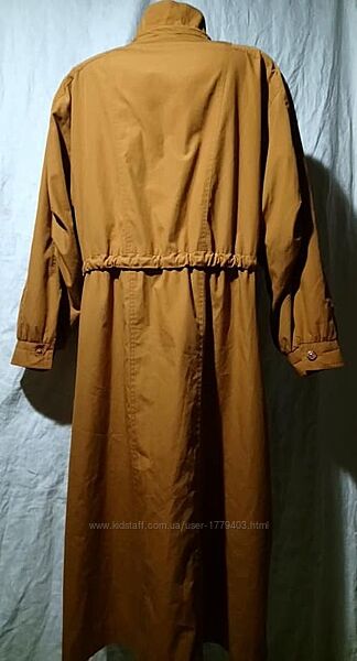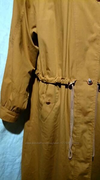 Женский плащ р.54-56, на подкладке, длинный, цвет светло-коричневый. Застегивается на пуговицы. Два наружных кармана, удобные, глубокие, застегиваются на пуговицы, один нагрудный карман с левой стороны застегивается на молнию, внутри с левой стороны карман застегивается на пуговицу. Рукава реглан, объемные, с манжетами, которые застегиваются на пуговицу. Обхват талии можно регулировать шнуром. Обхват горловины тоже регулируется шнуром.Состав 35% коттон, 65% полиэстер; подкладка 100% полиэстер.