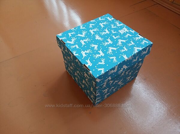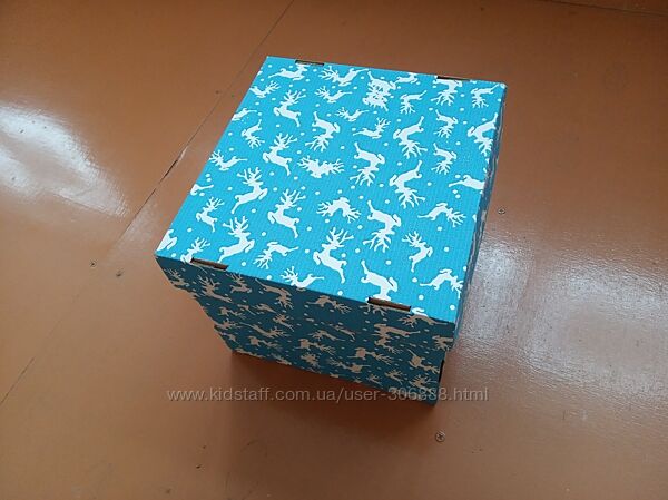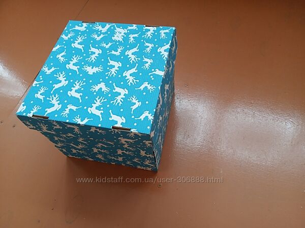 Нова новорічна пакувальна коробка з оленями.Розміри коробки 22.5 на 22.5 см, кришки 23 на 23 см. Висота 20 см.