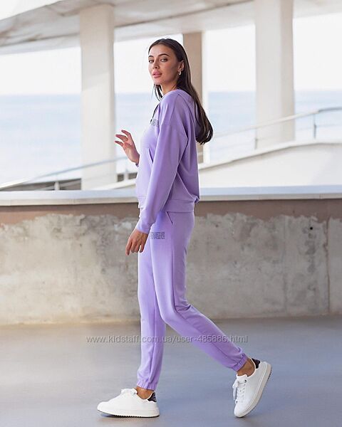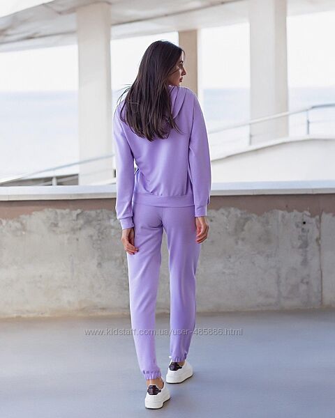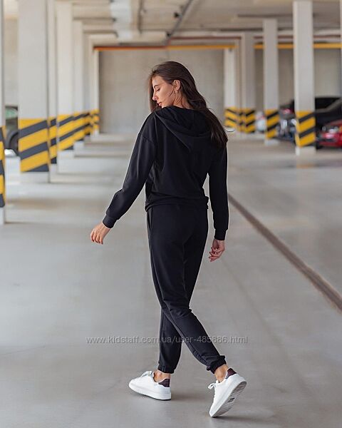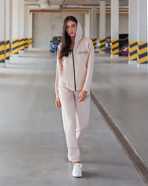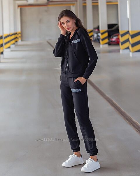Штаны высокой посадки. прямого кроя, на резинке , с карманами по бокам. Толстовка на молнии на манжетах, оснащена капюшоном и боковыми карманами.