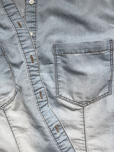 Рубашка под джинс. Носилась мало, в идеальном состоянии!Светло голубая с выбеленными потертостями. Цвет может искажаться, так как камера сама делает цветокоррекцию 🤷🏼♀️