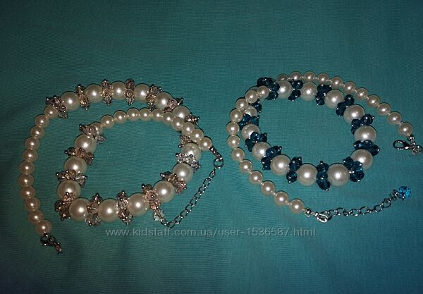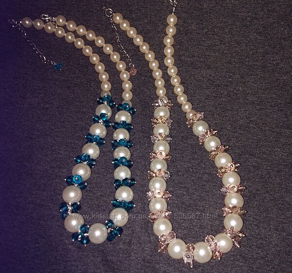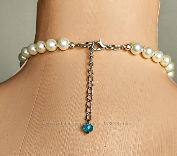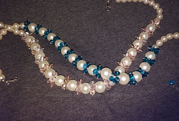 Колье ′Вечернее-2′ собрано из ′жемчуга′ 10 і 7 мм (качественная имитация - стекло) и кристаллов 4х6 мм синего цвета (оттенка ′циан′) на надёжном металлическом ювелирном тросике.