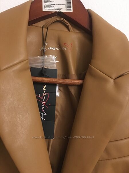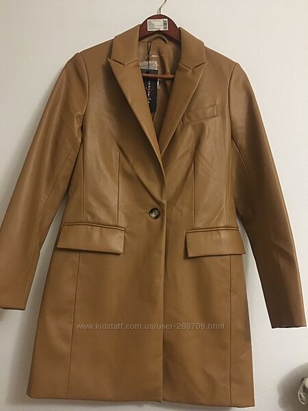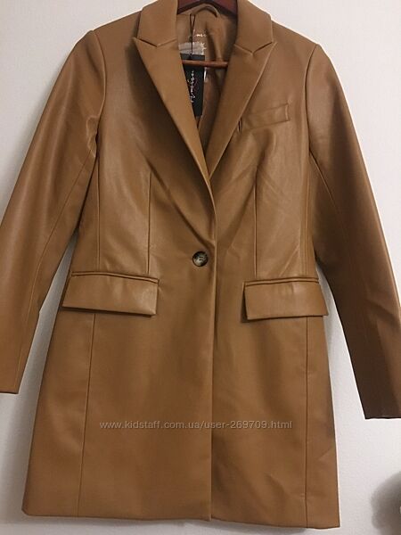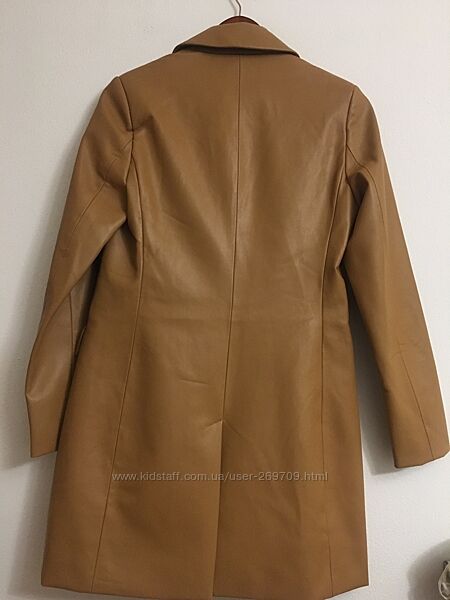 Довжина 85 см, плечи 38 см, рукав від плечей 62 см, ПОГ 46 см, ПОБ 49 см Стильний фірмовий тренч ,плащ фірми Amisu з штучної шкіри , актуального коричневого кольору, річ нова з бірками