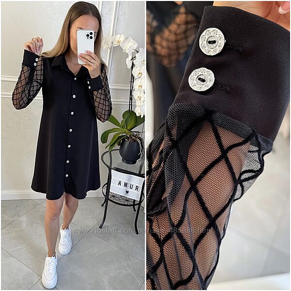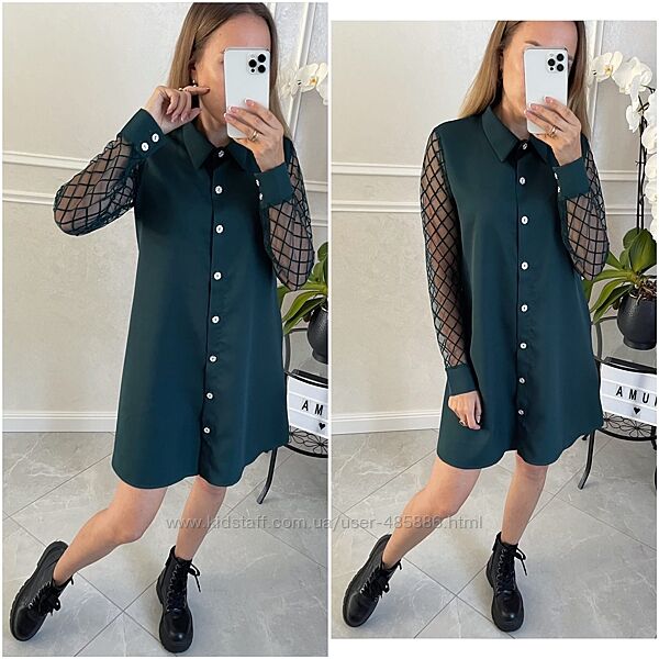 Платье-рубашка с воротником стойка, рукава выполнены из сетки с узором клетка из флока( бархатистое на ощупь)
