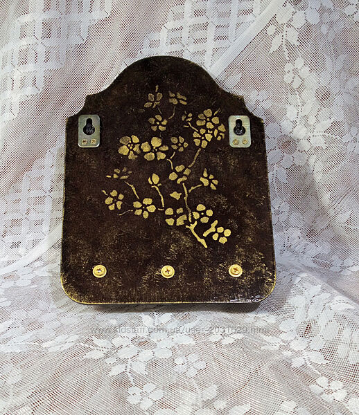 Ключница настенная на три крючка, материал основы МДФ, передняя сторона покрыта шпоном, крепится с помощью двух подвесов. Размер 16*22 см. Трафаретный рисунок с обеих сторон, глянцевый акриловый лак на водной основе. Возврат не предусмотрен.