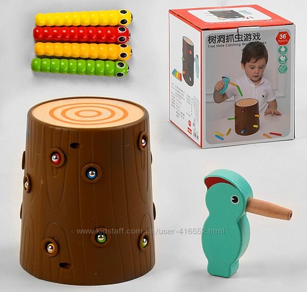 Птичка, что и будет доставать червячков - дятел. Он изготовлен из дерева и окрашен в приятный голубой цвет с ярко-красным хохолком. В его клювике установлен магнитик, который поможет вытянуть червячка из дерева.