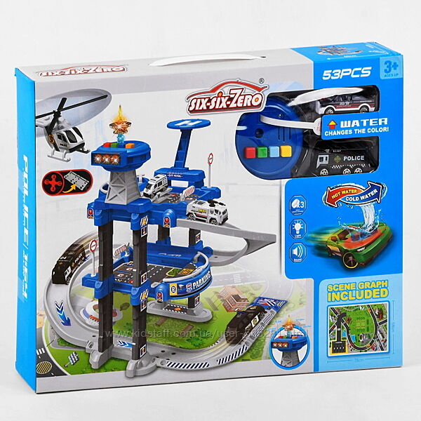 станция с парковкой группы быстрого реагирования пожарной спецслужбы представлена в виде 3-х этажной конструкции с резкими спусками, парковочными местами и вертолётной площадкой. Парковка выполнена в сигнально красном цвете и дополнена яркими, разноцветными наклейками с различными надписями, дорожными знаками и парковочными площадками. Модель обладает крутым спуском, что начинается с заезда на первом этаже и заканчивается на последнем 3-м этаже. Место под парковку специально отведено на яркой карте, чтобы станция могла комфортно стоять в центре города и быстро реагировать на любые срочные вызовы. Первый этаж оборудован крутым заездом, а второй уже насчитывает несколько парковочных мест, которые защищены шлагбаумом. На третьем этаже встроена вертолетная площадка и сигнальный блок пост, что оснащен световыми и звуковыми эффектами. Эффекты модели:- при нажатии на любую кнопку вышка подсвечивается синим цветом, а сигнальные огни красным цветом;